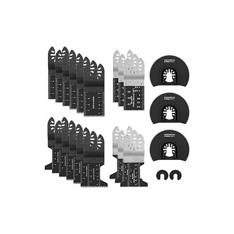 Kit lama per sega oscillante: questo set comprende 23 pezzi, di cui 7 diverse lame per sega, per il taglio di legno, metallo, plastica e altri materiali, ogni tipo di lama per sega è specifico per un uso particolare. Le nostre lame per seghe oscillanti possono soddisfare una varietà di esigenze, che potrebbero essere utilizzate per l'officina, la casa o qualsiasi altro luogo. Lame multiutensile di alta qualità: realizzate in acciaio al carbonio di alta qualità.alto contenuto di carbonio e utilizzando tecniche di produzione di alta qualità, garantiscono velocità di taglio, tolleranza all'usura e durata superiori. Lame per utensili con design oscillante Speciale: marcatori di lunghezza incorporati su due lati, un lato in pollici e l'altro in centimetri, consentono di ottenere tagli precisi facilmente e rapidamente mentre lavori con questo. 2 tipi di lame per sega di precisione dal design speciale hanno denti ondulati più lunghi appositamente progettati per fornire tagli più rapidi e