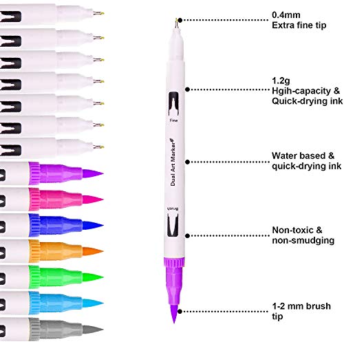 Uso versatile: il set di pennarelli a doppia punta può fare tutto. È perfetto per disegnare, illustrazioni, calligrafia, creazione di biglietti, stampaggio, libri a colori e qualsiasi altra cosa tu abbia idea. Non importa le tue esigenze, questi pennarelli ti hanno coperto