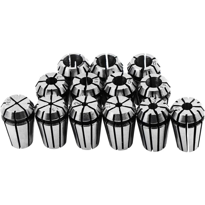 Gamma di presa - : 13 clip a molla ER11 include le seguenti dimensioni di morsetto: 1 mm, 1,5 mm, 2 mm, 2,5 mm, 3 mm, 3,5 mm, 4 mm, 4, 5 mm, 5,5 mm, 6 mm, 6,5 mm, 7 mm). Ottima fattura, buona elasticità e alta precisione. 【Qualità Premium】: queste clip a molla sono realizzate in acciaio per molle di alta qualità, stabili e pratiche nelle prestazioni. Set di pinze caricate a molla per trapano, fresatrice CNC, mandrino o supporto 【Design】: il mandrino caricato a molla offre la massima potenza di presa. Doppio angolo per una migliore precisione. Il collare deve essere posizionato nella ghiera della pinza prima di inserirlo nel mandrino della pinza. Per una presa potente e un bloccaggio parallelo per macchine per incisione CNC e utensili per fresatura. 【Applicazione】: adatto per foratura, fresatura, foratura, maschiatura, incisione, CNC, mandrini e altre lavorazioni. Per utensili di tornitura CNC e macchine per incisione 【Facile da distinguere】: ogni morsetto è ben imballato in un