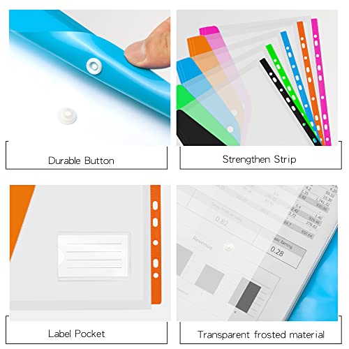 Tasca pre-perforata: ogni tasca da perforazione ha 11 fori a sinistra, perfetta per la maggior parte dei raccoglitori ad anelli e cartelle di file estesi. Ogni tasca da perforazione ha un pulsante resistente può impedire che i file cadano. Sia usato da solo che con cartelle, può garantire la massima sicurezza dei file.