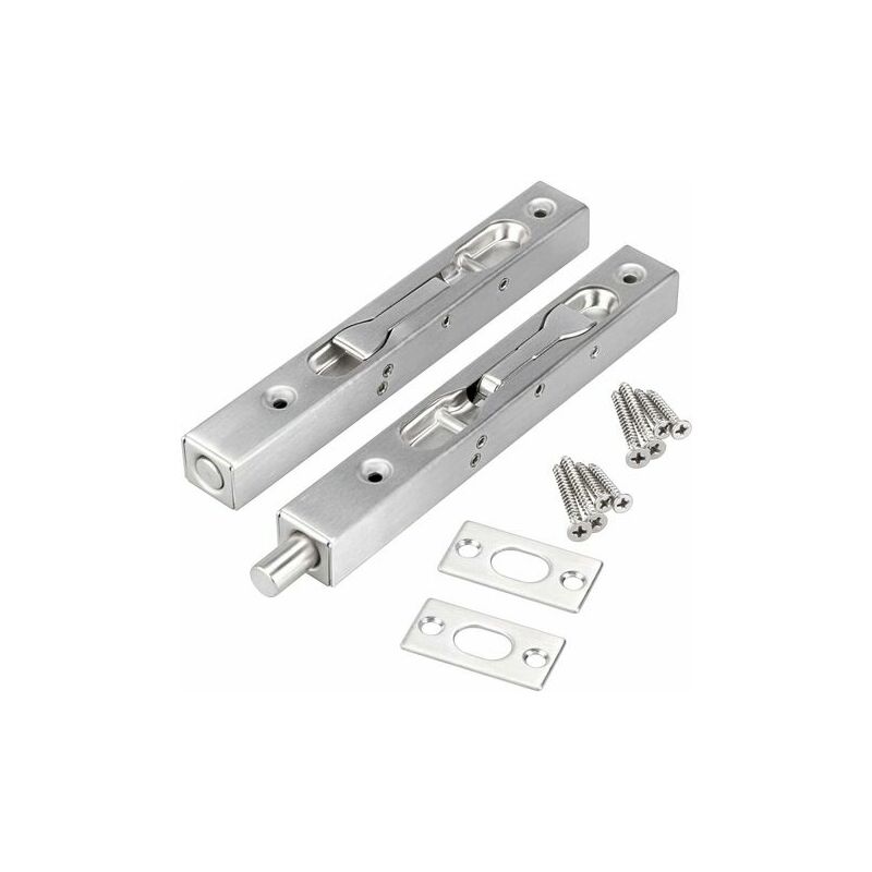 Dimensioni del bullone a filo: 16 cm (lunghezza) x 2 cm (larghezza) x 1,6 cm (spessore), la profondità della gola richiesta è 1,6 cm, 1,5 bullone con sporgenza cm spesso utilizzato su una delle coppie di porte in legno, lasciando l'altra porta per il traffico normale, adatto anche per porte interne realizzato in acciaio inossidabile 304 e finitura spazzolata, antiruggine e di lunga durata, donano un tocco di eleganza e qualità alle porte Leva a molla come il bullone grezzo dall'alto verso il basso, facile da usare e adatta ai bordi e al lato posteriore della porta contenuto della confezione: 2 bulloni di sicurezza per porta, 2 piastre di attacco, 8 viti di installazione;