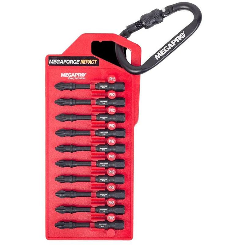 Le punte ad impatto MegaFORCE di Megapro per uso industriale sono realizzate con un acciaio S2 appositamente modificato, che consente di assorbire carichi d'impatto elevati e di offrire la massima durata e prestazioni. Le punte sono lunghe 2 pollici e sono rifinite con un rivestimento in ossido nero che le protegge dalla corrosione. Ogni dimensione di punta è codificata a colori per facilitare la selezione e la confezione è dotata di una clip a moschettone che può essere agganciata rapidamente alla cassetta degli attrezzi o alla cintura. Questo set contiene dieci punte a percussione Phillips da 2″. Caratteristiche S2-Stahlbits, Schwarzen Oxidschicht Peso del tessuto 0,09 Dimensione in mm 1524 × 6.4 × 0.64 cm Dimensioni dell'imballaggio 1.0