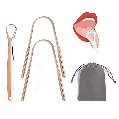 【Pacchetto incluso】 Tre puliscilingua in acciaio inossidabile oro rosa (2 forme a U + una piccola apertura) e una borsa con coulisse.
