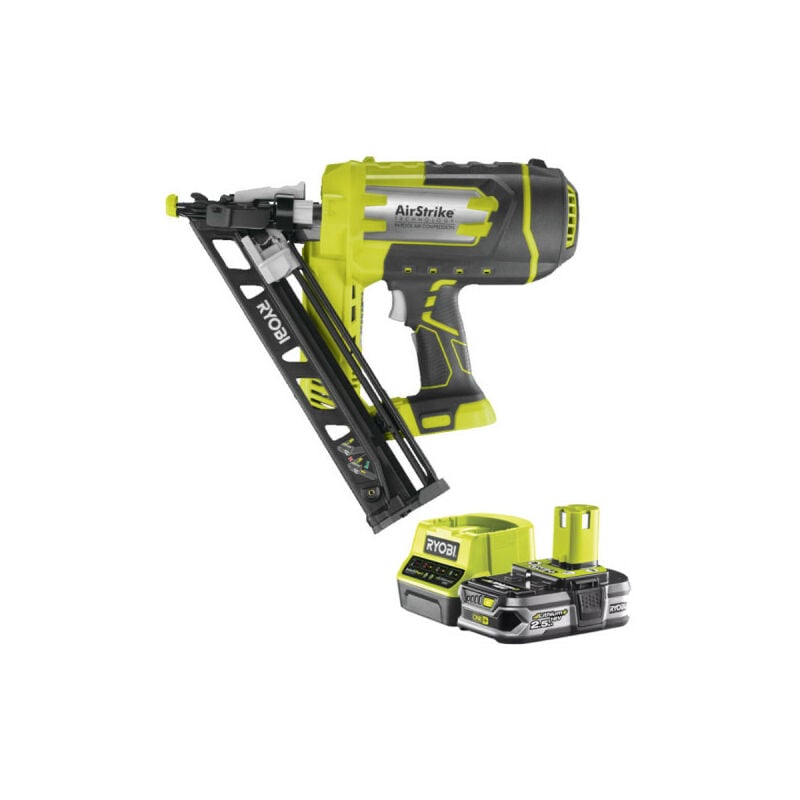 Presentazione: RYOBI 18V OnePlus R15GN18-0 Inclined Air Finish Nailer Pack - 1 Batteria 2,5Ah - 1 Caricatore rapido RC18120-125 con una chiodatrice dotata di tecnologia AirStrike che vi risparmia il fastidio di un compressore o dell'uso di cartucce di gas. Il caricatore può contenere fino a 105 chiodi di lunghezza compresa tra 24 e 64 mm e larghezza di 1,6 mm. La chiodatrice è dotata di un comodo sgancio per i chiodi incastrati e non si spara se il caricatore è vuoto. Sulla parte anteriore è presente una luce LED che illumina l'area di lavoro in caso di oscurità. Vantaggi: OnePlus R15GN18-0 Chiodatrice pneumatica inclinata da 18 V per finitura: Una chiodatrice ad aria compressa che funziona senza compressore o cartuccia di gas Spara chiodi con un angolo di 15G 110 rivista per unghie Accuratezza garantita Adatto per chiodi di lunghezza compresa tra 24 e 64 mm e larghezza di 1,8 mm. Alimentazione con batteria da 18 V (venduta separatamente) della gamma OnePlus 2 luci LED per