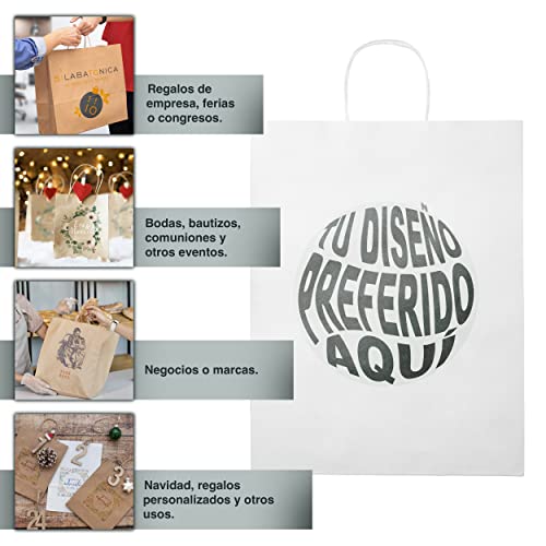 Confezione da 50 sacchetti di carta bianca | Logo o immagine a colori | Personalizzabili per eventi | Riciclabili e con manici | Dublino 30 x 25 x 10 cm