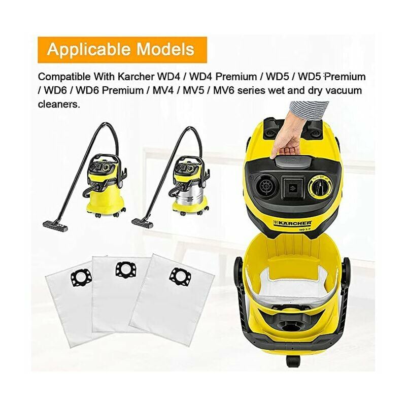 Modelli applicabili Il sacchetto per la polvere è compatibile con gli aspirapolvere Karcher WD5, WD6, WD4, WD4P/WD4 Premium, WD5P/WD5 Premium, WD6 P/WD6 Premium, MV4, MV5, MV6, WD 4.000, WD 5.999.< ;