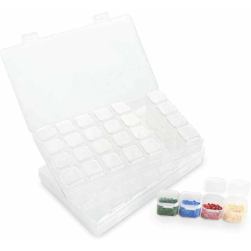 Caratteristiche: Materiale: plastica PP, PVC, autoadesivo. Dimensioni: la dimensione della scatola è di circa 11,2 x 17,5 x 2,7 cm. Confezione da 2 scatole da 28 scatole di plastica trasparente - Ogni scatola contiene 7 file indipendenti di 4 scatole coordinate per una facile conservazione e separazione di piccoli oggetti. Perfetto per conservare piccoli gioielli, pillole, quadri con diamanti, accessori per il trucco, ecc.