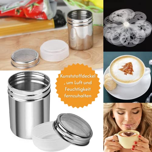 Confezione da 2 spargitori in acciaio inox per cioccolatini, escavatore, caffettiera con coperchio a maglia fine, per il ristorante, con 16 stencil a pressione