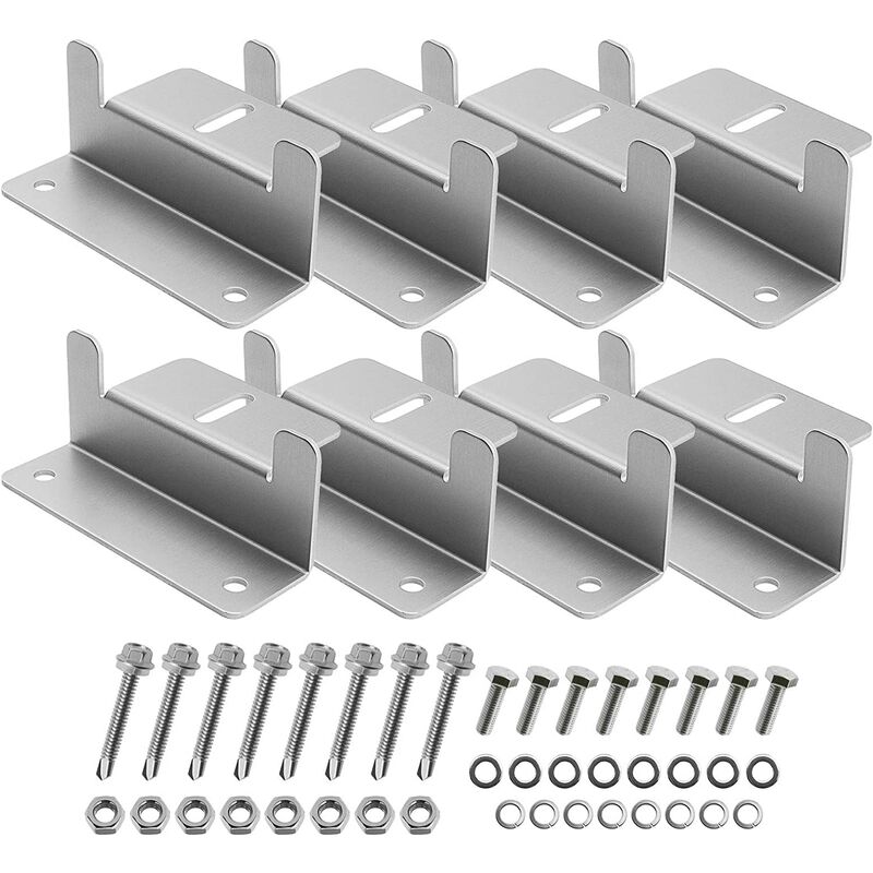 Design tipo Z: design unico, ideale per superfici irregolari, può montare pannelli su camper, caravan, yacht, capannoni, ecc. Alte prestazioni: realizzato in lega di alluminio di alta qualità, anti- corrosione, antiruggine, resistente all'usura e durevole. Dimensioni della staffa: la larghezza del pannello delle viti di montaggio è di 30 mm e la lunghezza totale è di 100 mm. Facile da usare: lega di alluminio leggera costruzione, facile da trasportare e installare, ideale per il montaggio di una vasta gamma di pannelli solari. Contenuto della confezione: questo kit di montaggio del pannello solare contiene 8 staffe di montaggio a 2 fori, 24 bulloni, 24 rondelle e 8 dadi.