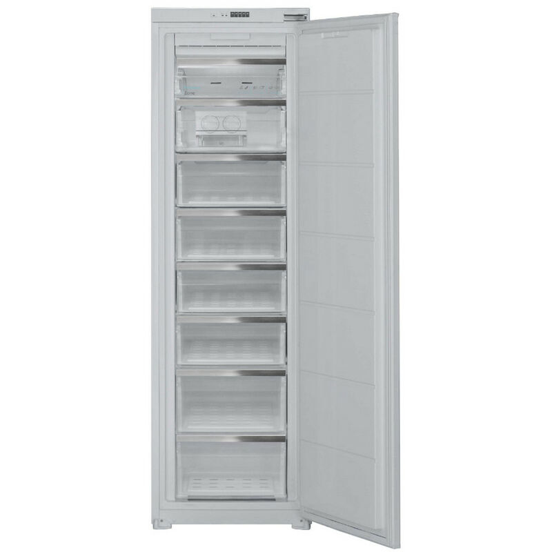 Congelatore verticale da incasso Sharp SJSE197E01X con Freddo Ventilato No Frost: L'aria secca viene azionata per rimuovere l'umidità, impedendo la formazione di brina. SpaceSaverDoor: apertura della porta a 90°, senza sfalsamento, che consente di premere il microtelefono contro il muro. Twist Ice Maker (mobile): 2 vaschette per cubetti di ghiaccio con facile rilascio del cubetto di ghiaccio grazie alle maniglie. Tipo di prodotto: congelatore da incasso. Tipo di costruzione: Integrabile. EEI: 100. Volume totale (L): 197. Classe di efficienza energetica: E. Emissioni di rumore aereo (dB(A)): 40. Classe di emissione acustica nell'aria: C. contro di energia annua (kWh/anno): 231. Classe climatica: SN-T. Questo dispositivo è progettato per essere utilizzato a una temperatura ambiente compresa tra 10°C e 43°C. Impostazione invernale: no. Volume scomparto a 4 stelle (L): 197. Temperatura consigliata per una conservazione ottimale degli alimenti in uno scomparto a 4 stelle (°C): -18.