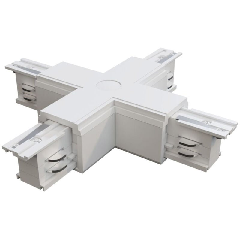 Collezione Accessories For Tracks Trinity CONNETTITI CON L'ESSENZIALE Il connettore a X per binario in plastica bianca è un componente essenziale del sistema di binari progettato per il montaggio a incasso. Questo tipo di connettore è in grado di collegare quattro binari in modo sicuro ed efficiente, consentendo di creare configurazioni a croce o a quadrato a seconda delle esigenze di illuminazione dell'ambiente.