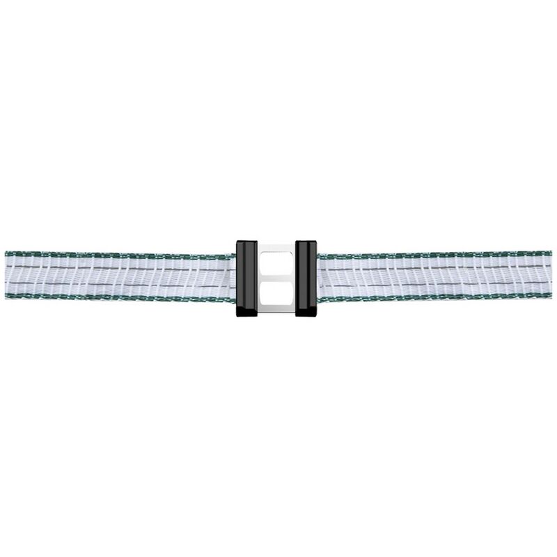 In acciaio inox. completo di supporti a clip in plastica nera. in blister da 5 pezzi.442002 per fettuccia h.40 mm max.