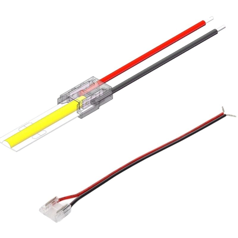 Collegamento per unire strisce led cob da 10mm al trasformatore Fissaggio semplice e veloce tramite leggera pressione del connettore sulla striscia led, evitando saldature. Realizzato in PC trasparente e rame.