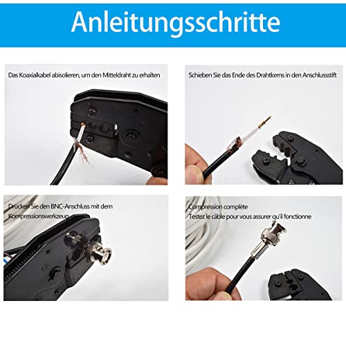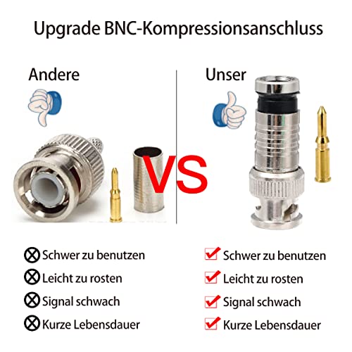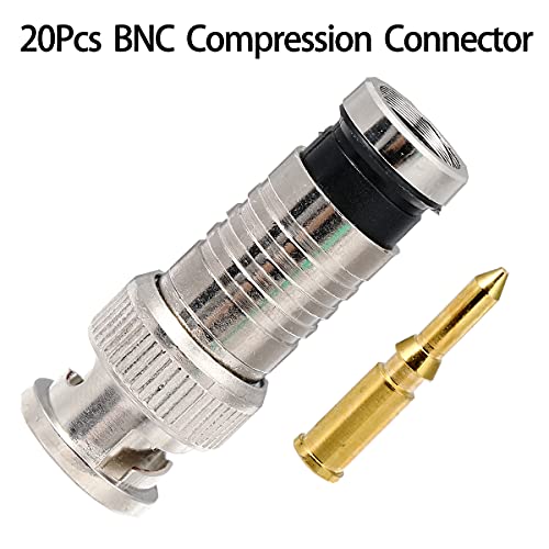 1. Design speciale migliorato: connettori di compressione RG59-BNC a 20 pezzi con perno fisso. È possibile assicurarsi che il filo centrale penetri in modo più preciso, semplice e veloce, non si pieghi, meglio rispetto ad altri connettori BNC tradizionali. Il connettore è molto semplice per utilizzare un cavo coassiale siamese rg-59, basta utilizzare il nucleo del cavo coassiale, inserire il connettore di compressione e comprimere.