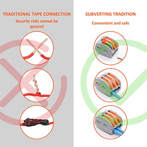 【Come usare】Questi connettori per cavi sono molto facili da usare. Innanzitutto, premere la maniglia verso l'alto e inserire il filo nel foro del filo. Dopo aver appoggiato la maniglia, bloccare saldamente il filo. L'installazione può essere completata in pochi minuti seconds.No per collegare e scollegare sono necessari strumenti.