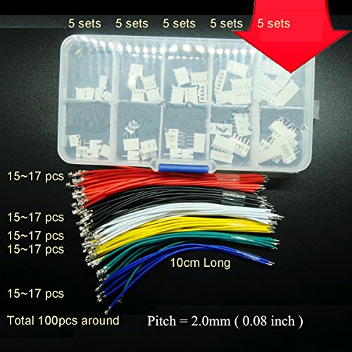 100 cavi da 10 cm con 25 set di connettori JST PH2.0 passo da 2 mm, connettori da 2 a 6 punte