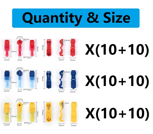 SET di 30 connettori a T + 30 connettori a spina piatta (ogni set è composto da 10 blu, 10 rossi, 10 gialli)