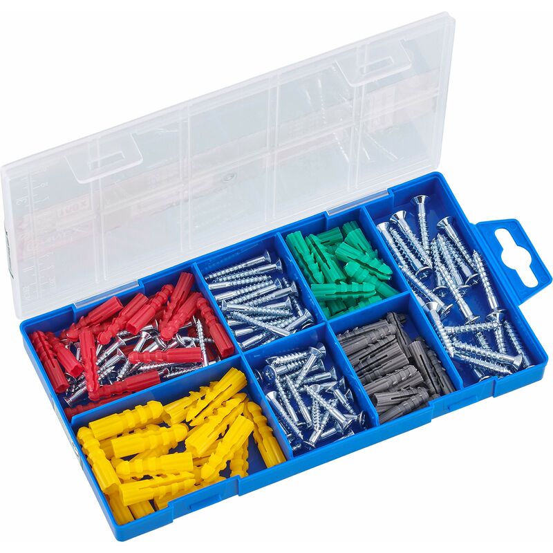 160 pz. viti e tasselli in pratica valigetta plastica contenuto: viti T.P.S. finitura zincata: 25 pz. Ø 3,5 x 25 mm. 20 pz. Ø 4,0 x 25 mm. 15 pz. Ø 4,0 x 32 mm. 20 pz. Ø 5,0 x 32 mm. tasselli plastica: 25 pz. Ø 5 x 25 mm. 20 pz. Ø 6 x 30 mm. 15 pz. Ø 7 x 27 mm. 20 pz. Ø 8 x 30 mm. in pratico box plastica per mantenere tutto in perfetto ordine