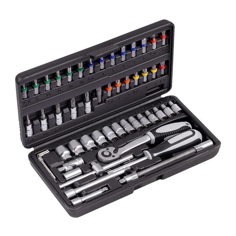 Attrezzatura solida: attrezzatura di base ideale per vari lavori di avvitatura nel fai-da-te, officina, garage, ecc. | Ampia scelta di prese, punte e accessori | Con cricchetto reversibile. - Buona fattura: cricchetto reversibile con 72 denti e funzione di sgancio rapido | Prese in acciaio al cromo vanadio per impieghi gravosi | Punte codificate a colori per una facile identificazione | Robusta custodia in plastica e