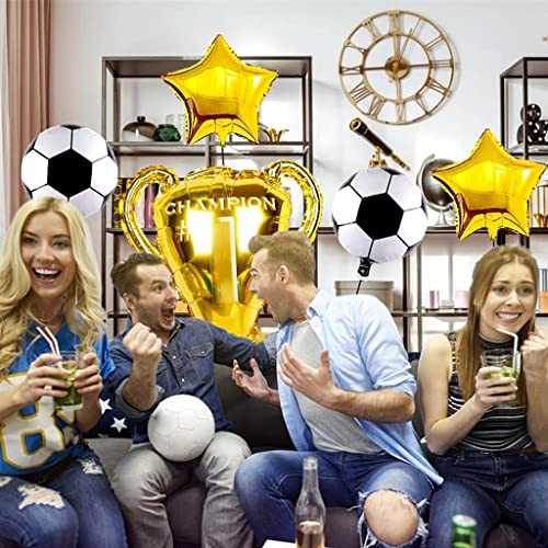 ⚽ 14. Decorazione per compleanno di calcio: 1 * palloncini Gold Pokal Champion + 2 * 32 pollici nero numero in pellicola + 2 * palloncini in pellicola da calcio + 2 * palloncini in pellicola oro da 18 pollici + 1 * nastro di seta + 1 * tubo di soffiaggio.