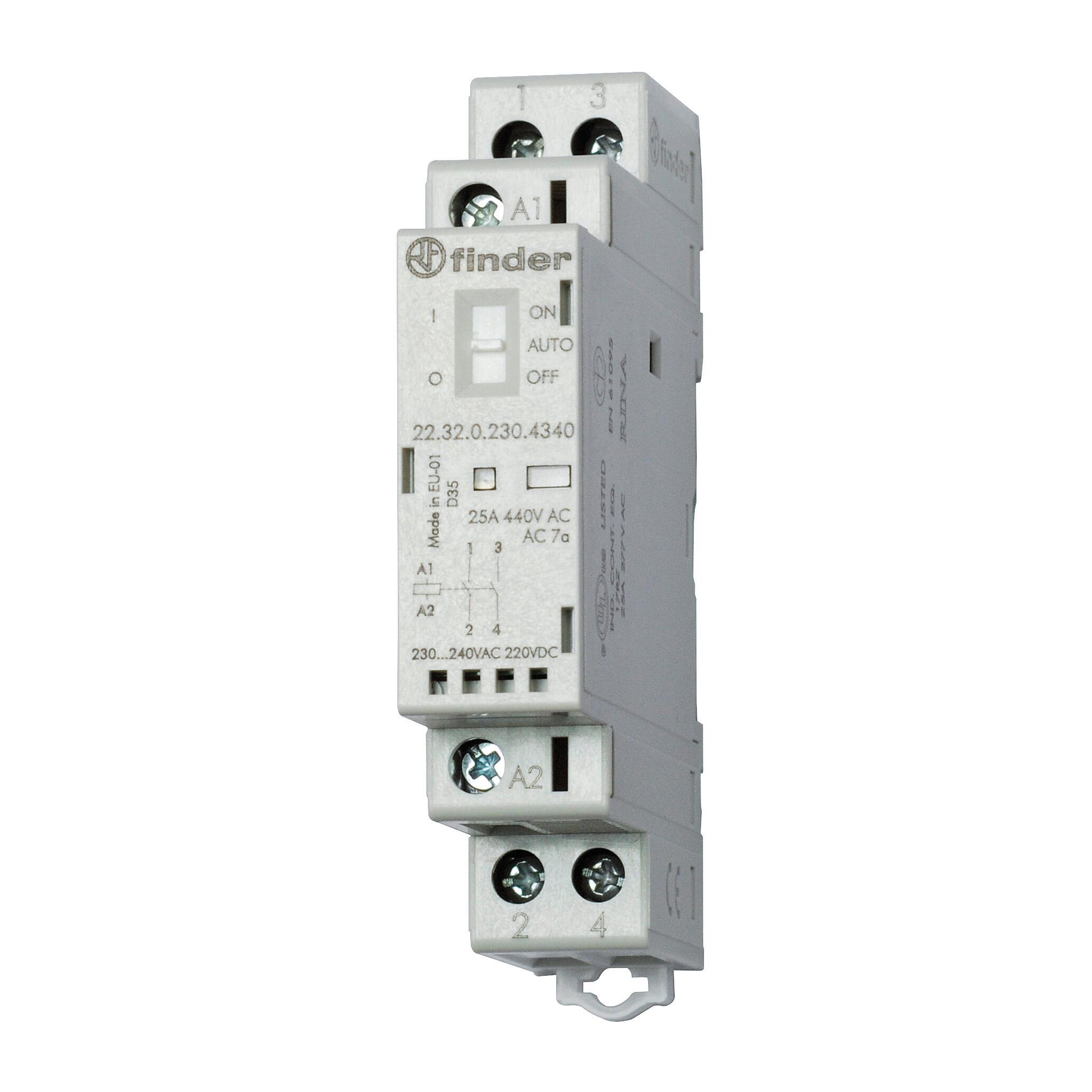 Indicatore meccanico + LED, Standard, 230...240 V, 1 NO + 1 NC, 2 contatti, 25 A, AgSnO2, AC (50/60Hz)/DC, Contattore modulare, 25 A. Ideale per comandare luci in uffici, bagni, aule, gestire l'illuminazione pubblica (strade e parcheggi) e abilitare l'energia nelle camere degli hotel