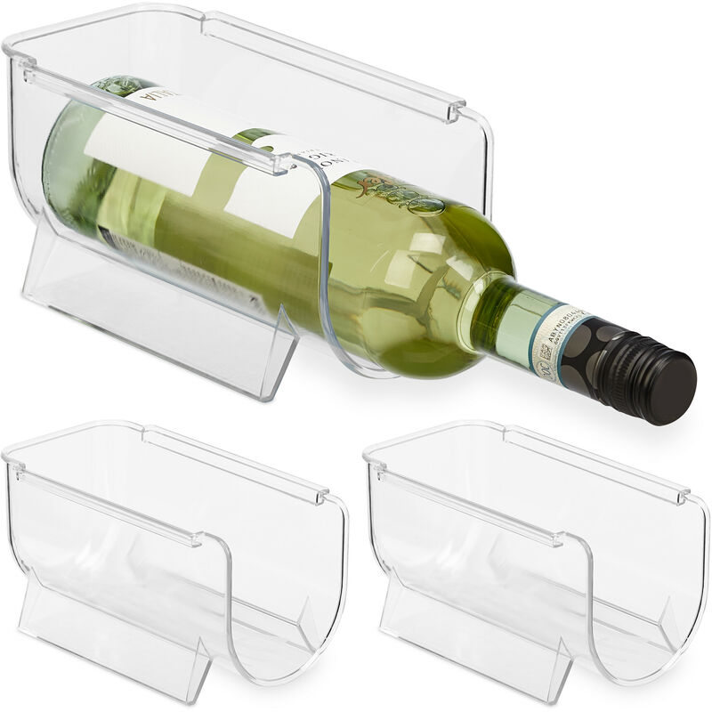 Ora puoi dire addio alle bottiglie che scivolano via dallo scaffale del frigo! Il pratico organizzatore ti permette di poggiare bottiglie e barattoli in posizione orizzontale, mantenendole al loro posto. Non solo le bottiglie non scivoleranno più, ma potrai usare in modo ottimale lo spazio nel frigorifero. La struttura trasparente ti permetterà di sapere sempre cosa è contenuto nel supporto. Se vuoi creare un vero e proprio sistema di organizzazione nella tua cucina, puoi impilare più contenitori insieme. Organizer da frigo in dettaglio - Dimensioni H x L x P: 10,5 x 11 x 20,5 cm ca. - Dimensioni interne H x L x P: 9,5 x 9 x 19,5 cm ca. - Peso: 150 g ca. - Materiale: plastica PET (libera da BPA) - Colore: trasparente - Set da 3 contenitori Scatola porta bottiglie per il frigorifero - Per riporre le bottiglie in maniera ordinata nello scomparto frigo - Pratico modo per ottimizzare lo spazio in cucina - Le bottiglie vengono riposte in maniera orizzontale - Per estrarre le bottiglie