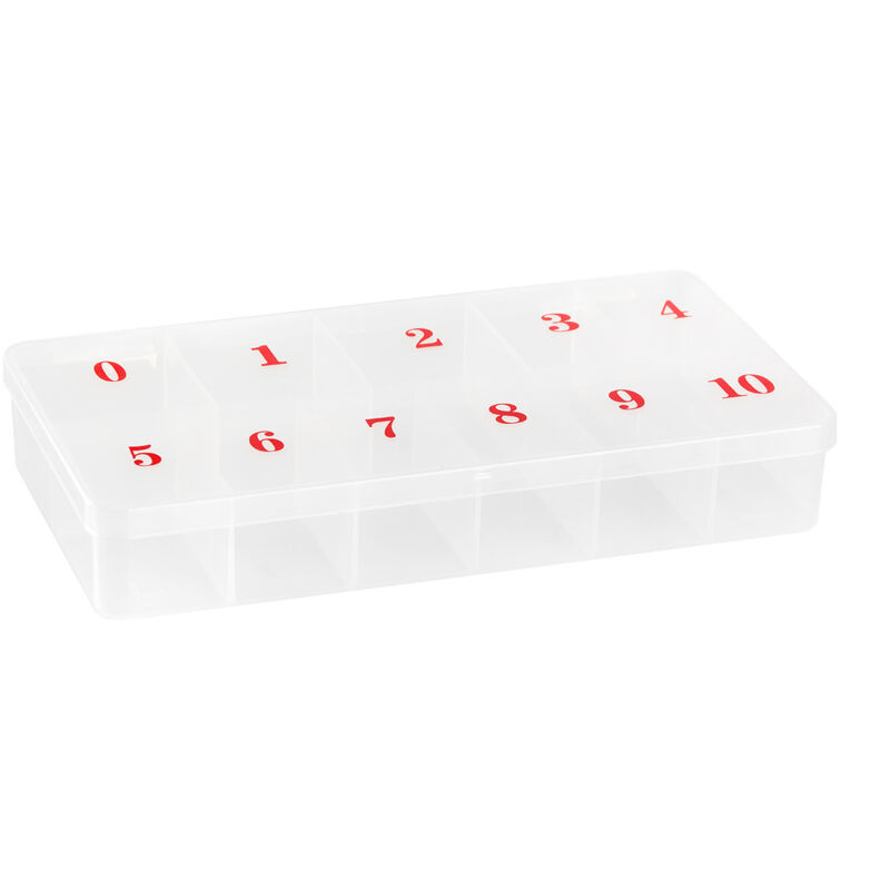 Un organizer funzionale con undici scomparti numerati ti aiuta a organizzare piccoli accessori per lo styling delle unghie o le estensioni delle ciglia. Le diverse dimensioni dei contenitori permettono di riporre decorazioni e pizzi di diverse dimensioni. La scatola è ideale anche per riporre piccoli utensili per altri trattamenti cosmetici e grazie alla chiusura i prodotti non possono fuoriuscire durante il trasporto. Un modo pratico per riporre gli oggetti. Il pratico contenitore è realizzato in plastica, il che lo rende resistente e facile da pulire. Permette di mantenere l'igiene e l'ordine tra gli accessori riposti. Il materiale di cui è realizzato l'organizzatore è trasparente, il che rende molto più facile trovare determinate decorazioni e punte, il che migliora significativamente il lavoro di styling delle unghie. Perfetto per saloni di bellezza privati e professionali. Il colore neutro e il design minimalista si adattano perfettamente allo stile di qualsiasi interno.