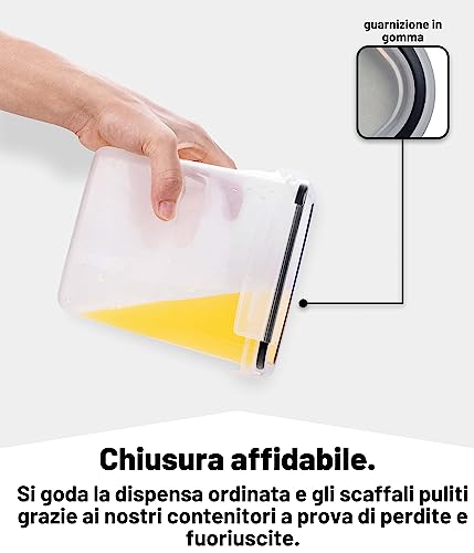 NIENTE FUORIUSCITE - Ogni contenitore per alimenti è dotato di coperchio a chiusure laterali. Questi creano un sigillo ermetico per mantenere cibo fresco più a lungo e previenire fuoriuscite di liquidi.