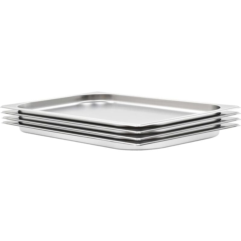 Questi contenitori Gastronorm impilabili saranno un'ottima aggiunta ai vostri accessori da cucina. Realizzata in acciaio inossidabile e robusto, la teglia da cucina a vapore ha una costruzione solida ed è facile da pulire. Il materiale resistente evita i graffi e facilita la manutenzione. La teglia per alimenti ha le dimensioni standard dei formati Gastronorm, consentendo così un uso universale e un ampio campo di combinazioni. In particolare si adatta perfettamente a tutti gli elettrodomestici da cucina e le attrezzature professionali come bagnomaria, scaldavivande e buffet di insalate. Questi contenitori sono impilabili e possono essere nascosti per risparmiare spazio, inoltre sono molto pratici e ideali per l'utilizzo in ristoranti, alberghi, feste e a casa. La consegna include 4 contenitori per alimenti. Colore: Argento GN 1/1 Dimensioni: 530 x 325 x 20 mm (L x P x A) Materiale: Acciaio inossidabile Volume massimo: 2,5 L La consegna include 4 contenitori per alimenti SKU: 50878