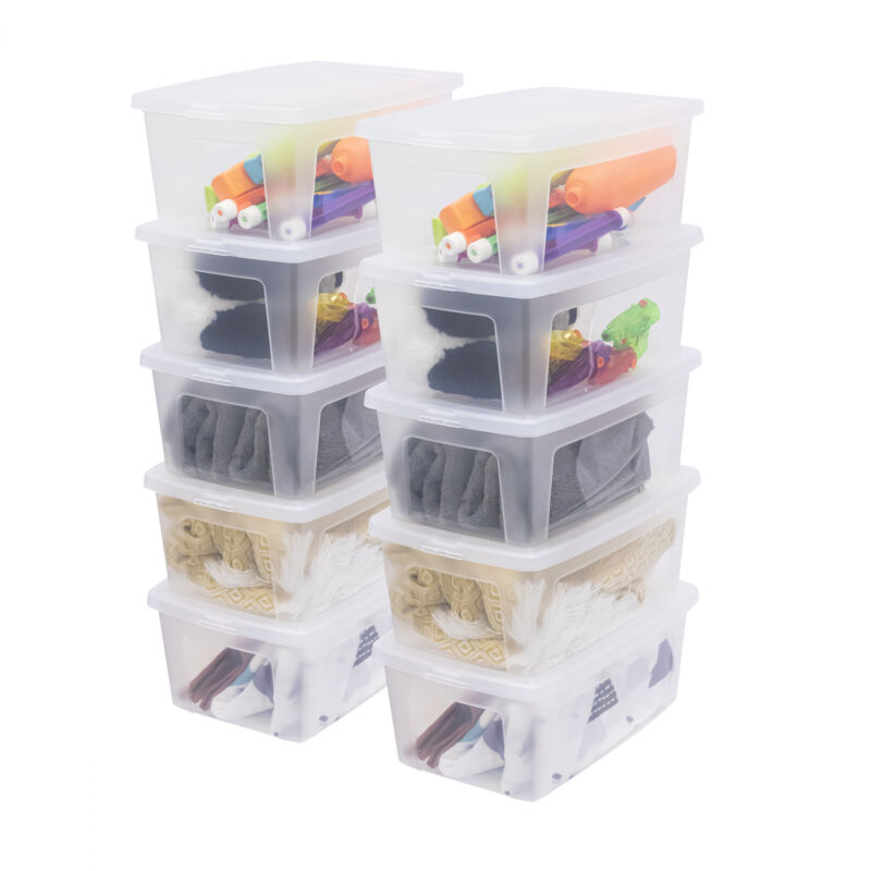La gamma di scatole trasparenti modulari di Iris Ohyama ha un'ampia scelta di dimensioni, che le rende perfette per ogni tipo di utilizzo. Le scatole sono realizzate in plastica traslucida per una facile identificazione del contenuto. Tutti i modelli della gamma possono essere combinati e impilati. Il coperchio delle scatole è robusto e curvo per garantire un impilamento stabile.