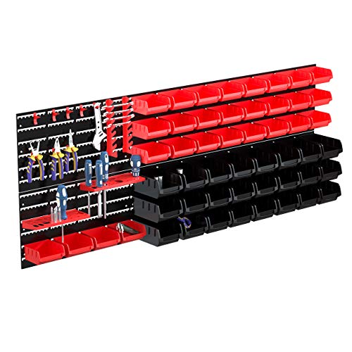 Cestini multifunzionali: 72 cassetti (dimensioni complessive: 141 x 54 cm), tra cui 24 grandi bidoni neri (16 x 10 x 7,5 cm), 28 piccoli bidoni rossi (10 x 10 x 5 cm), 6 tavole nere di montaggio (47 x 27 cm) e 14 accessori per riporre attrezzi. es, che è spazioso Abbastanza per riporre e organizzare accessori e piccole parti da hardware, viti, dadi, bulloni, rondelle, chiodi, forniture per ufficio, materiali decorativi per progetti fai da te, come perline, bottoni, clip, materiali per l'artigianato, trucco, gioielli, giocattoli, ecc