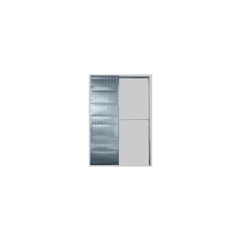 VERSIONE INTONACO. Ad un'anta, spessore 105 mm (camera interna 69 mm). Costruito interamente in lamiera di prima scelta dello spessore di 6/10 e 8/10. I pannelli presentano non le comuni pieghe verticali, ma bensì 14 pieghe orizzontali, più idonee a rendere più rigida e robusta l'intera struttura, senza fastidiosi rigonfiamenti alla camera interna del controtelaio. La rete elettrosaldata è formata da fili longitudinali e trasversali dal diametro di 2 mm. Binario completamente estraibile in estruso di alluminio con kit carrello a 4 cuscinetti a sfera (uno all'interno di ogni ruota) con portata di 120 Kg.