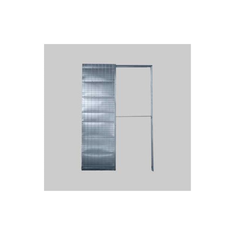 VERSIONE INTONACO. Ad un'anta, spessore 90 mm (camera interna 54 mm). Costruito interamente in lamiera di prima scelta dello spessore di 6/10 e 8/10. I pannelli presentano non le comuni pieghe verticali, ma bens 14 pieghe orizzontali, pi— idonee a rendere pi— rigida e robusta l'intera struttura, senza fastidiosi rigonfiamenti alla camera interna del controtelaio. La rete elettrosaldata Š formata da fili longitudinali e trasversali dal diametro di 2 mm. Binario completamente estraibile in estruso di alluminio con kit carrello a 4 cuscinetti a sfera (uno all'interno di ogni ruota) con portata di 120 Kg. Controtelaio per porte a scomparsa intonaco '90' 600x2100 mm Controtelaio a scomparsa