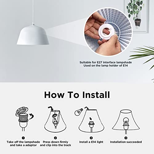 FACILE DA INSTALLARE: Può essere un buon sostituto che devi preparare per esigenze impreviste. Gli anelli di riduzione del paralume in plastica vengono utilizzati per installare la luce della vite E14 sul paralume E27, stanno aprendo il design in modo da poter regolare l'anello per adattarlo al paralume E27.