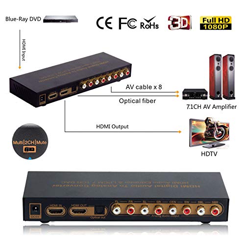 1. Si prega di notare che questo è un convertitore audio, non un decoder, se non si è sicuri, contattare il servizio clienti per confermare se soddisfa le proprie esigenze, grazie.1X ingresso HDMI e 1X uscita HDMI, possono sincronizzare la separazione del segnale audio HDMI. Supporta 1 uscita audio digitale ottica SPDIF, uscita audio analogica multicanale。