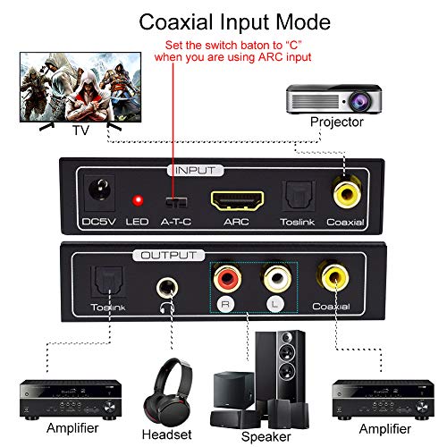 Convertitore DAC HDMI 192 Hz Arc Audio Extractor per HDMI Arc o Toslink, Ottico o Coassiale a Toslink, Ottico + Stereo G/D + Jack 3,5 mm Adattatore Arc Audio per TV.