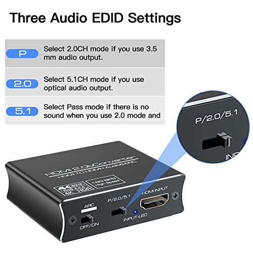 【Estrattore Audio HDMI 2.0】 Questo extractor audio HDMI estrae i segnali audio da HDMI per visualizzarli su ricevitori audio come altoparlanti, soundbar e amplificatore. L'uscita audio supporta interfacce ottiche (SPDIF) e 3,5 mm.