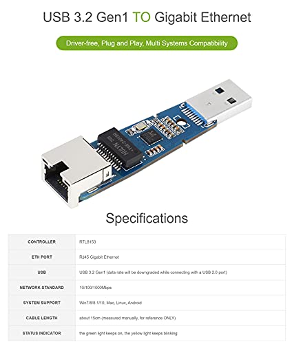 Convertitore da USB 3.2 Gen1 a Gigabit Ethernet con 10/100/1000 Mbps Standard di Rete, Compatibile con Raspberry Pi CM4, Jetson Nano, Supporto Win10/8.1/8/7/Mac/Linux/Android, Plug and Play