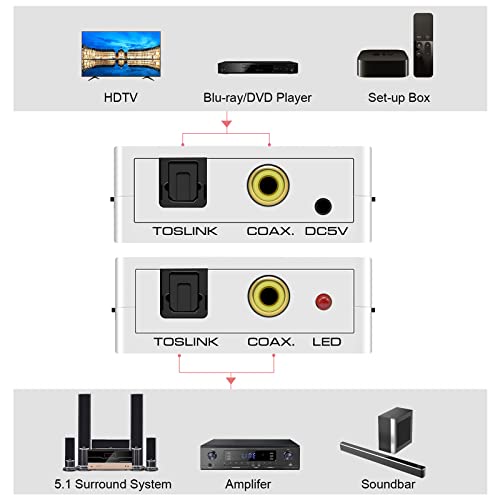 【Trasmissione senza perdite】 L'uscita della fibra di vetro può arrivare fino a 30 metri, l'uscita coassiale può raggiungere i 10 metri e la perdita è inferiore a 0,2 dB / m. Durante il processo di conversione non perde e non influisce sulla qualità del segnale audio, ottenendo una trasmissione senza perdite.