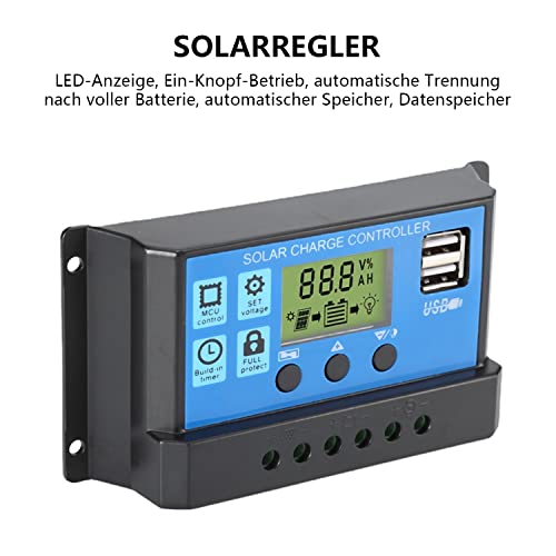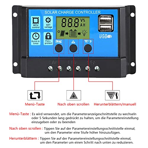 [Alta regolazione: temperatura di funzionamento: da 35 °C a 60 °C. Tensione della batteria: rilevamento automatico 12 V/24 V. Corrente di carica: 30 A. Corrente di scarica: 10 A. Tensione di uscita USB: 5 V/3 A, ricarica intelligente PWM a tre fasi, alta efficienza.