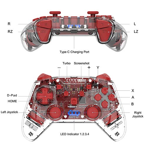COODIO Pro Controller Per Nintendo Switch, Wireless Switch Pro Controller Funzione di vibrazione Turbo Accessorio Per Ninendo Switch, Rosso Trasparente