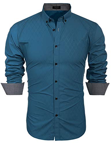 COOFANDY Camicia da uomo a maniche lunghe, casual, slim fit, con bottoni, Blu, L