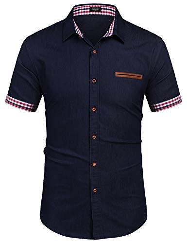 COOFANDY Camicie da Uomo Camicia di Jeans a Maniche Corte Camicia Estiva Denim a Quadri Slim Fit T-Shirt per Il Tempo Libero a Maniche Corte per Uomo Blu Navy S