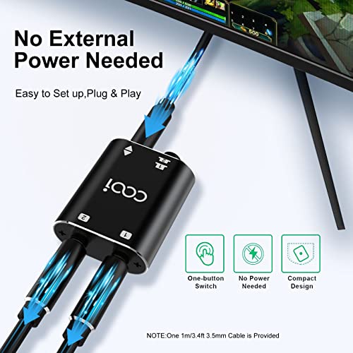 COOIDEA Switch Audio Stereo da 3,5 mm Supporta 1 Ingresso 2 Uscite o 2 Ingressi 1 Uscita con Cavo Audio da 3,5 mm, Selettore di Altoparlanti Audio AUX a 2 Porte per PC Telefono Laptop Cuffia.