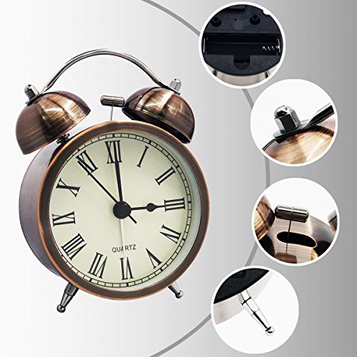 Stile classico - Placcato in rame antico, l'orologio di alta qualità vanta uno stile vintage con doppie campane e numeri romani. Oltre ad essere una sveglia, è anche una decorazione perfetta per camera da letto, scrivania, casa e ufficio, ecc.