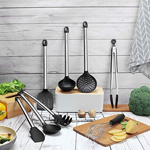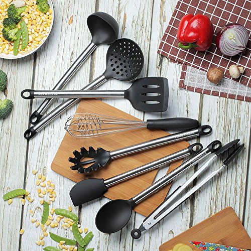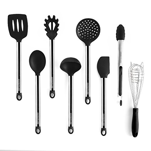 COOKSMARK, set di utensili da cucina, 8 pezzi, antiaderenti, resistenti al calore, in silicone e acciaio inox, lavabili in lavastoviglie, include 1 pinza, 1 schiumarola, 1 frusta, 1 spatola scanalata, 1 cucchiaio per servire, 1 mestolo, 1 colino, 1 spatola flessibile
