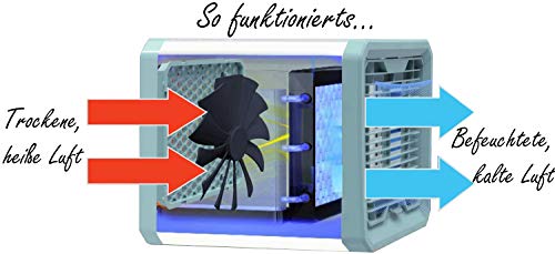 L'Air Cooler si distingue dai tradizionali ventilatori in modo che l'aria non solo venga raffreddata, ma anche umidificata e pulita, per migliorare il clima della stanza. L'Air Cooler è alimentato con un cavo USB, ma naturalmente è possibile anche con un adattatore, così come si trova su qualsiasi caricatore del telefono tramite la rete elettrica.