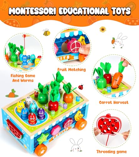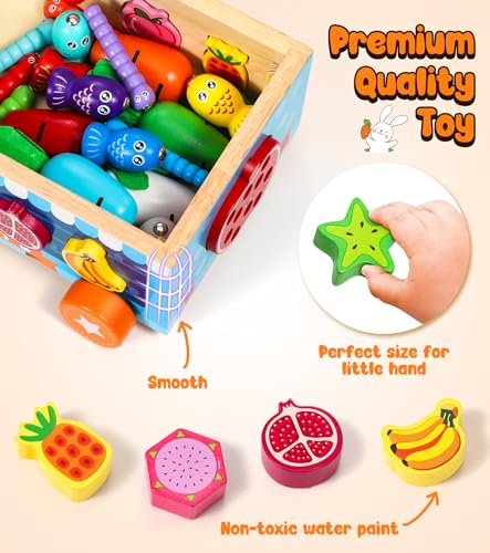 [Giocattoli Montessori per bambini di 2 anni] I giocattoli di smistamento in legno includono 6 pesci magnetici, 6 vermi magnetici, 5 carote, 8 blocchi di frutta normali e 2 grandi blocchi di frutta con fori. Gli accessori del prodotto includono una canna da pesca in legno, una clip in plastica e un filo di cotone per la navetta.