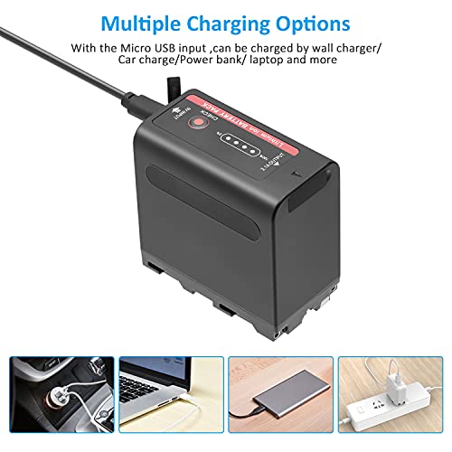 Batteria multifunzione NP-F970: (1) Ricaricabile direttamente con micro porte senza caricabatterie F970. Ricarica tramite un caricabatterie, un caricatore per auto o un computer portatile. (2) Funzione power bank. Con uscita USB da 5 V è possibile ricaricare tutti gli smartphone.