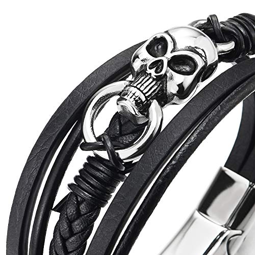 COOLSTEELANDBEYOND Acciaio Cranio Multi-Fila Nero Intrecciato Pelle Bracciale, Uomo Donna Braccialetto Cuoio